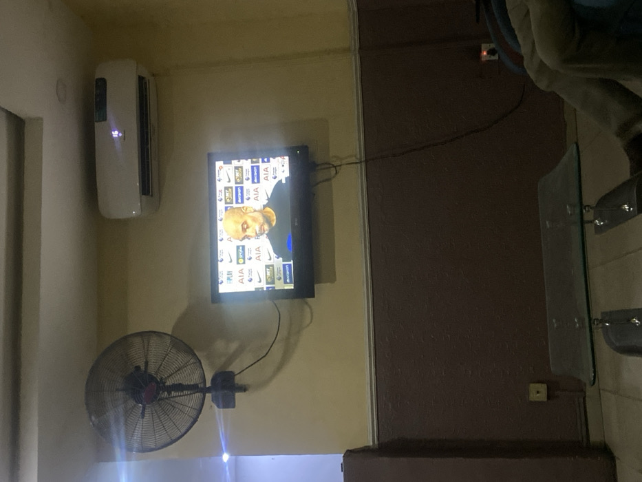 The scene depicts an interior room in Yenegoa, Nigeria. A flat-screen television is mounted on a light beige wall, displaying an image of Pep Guardiola, a bald man with a beard, seated at a press conference with sponsor logos (e.g., Premier League, AIA, Betway) visible in the background. To the left of the television, a dark-colored wall-mounted oscillating fan is affixed, with its power cord extending downwards. Above and to the right of the television, a white split-unit air conditioner is mounted, displaying the number "16" on its digital screen. The wall features a distinct two-tone design: light beige on the upper section and a textured dark brown on the lower section, separated by a white molding strip. In the foreground, a rectangular coffee table with a clear glass top and metallic legs is present. The lower legs and feet of an individual, clad in light-colored trousers and seated on a blue upholstered object, are partially visible in the lower right portion of the image. A power outlet is visible on the lower brown wall section. The room's lighting appears subdued, with the television screen providing significant illumination.