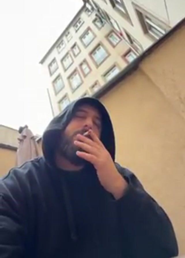 A man with a beard wearing a black hooded sweatshirt is sitting outdoors, smoking what appears to be a hand-rolled cigarette or joint. He takes a drag and exhales a large plume of smoke. The video is shot from a low angle, looking up at the man, with a building visible in the background. The sky is overcast. The wall behind him is tan. An umbrella is visible behind him on the left.
