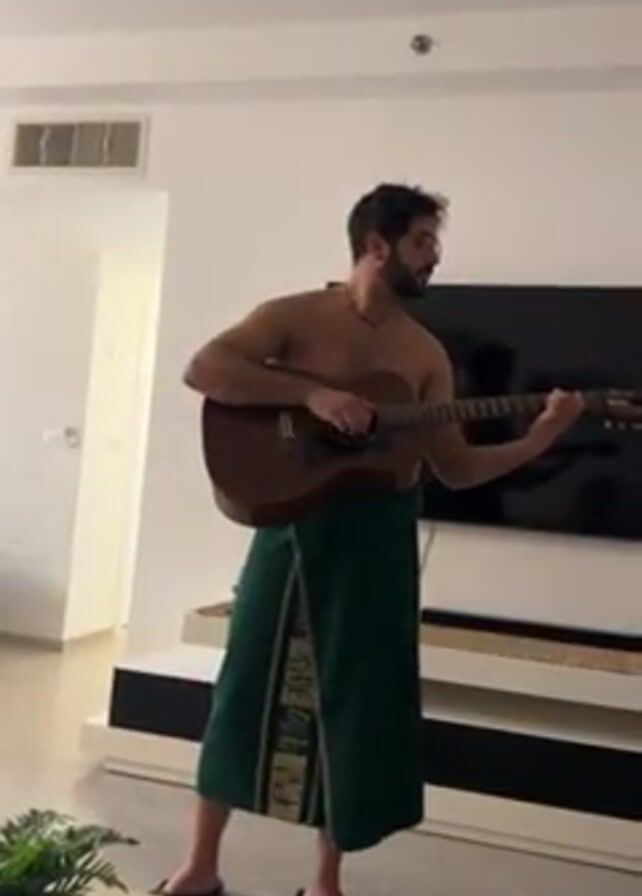 A shirtless man wearing a green patterned towel and brown sandals plays an acoustic guitar in a bright living room. He has dark hair and a beard. Behind him is a large flat screen television on a white console. A potted fern is on a low table on the left. A white wall and air conditioner are also visible. The man is looking away from the camera.
