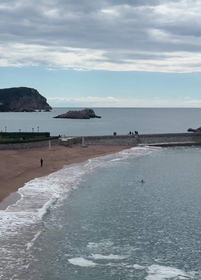 beach with waves lapping at the shore. There is a rock formation in the distance and a small group of people standing on a pier. A person is swimming in the water. The sky is cloudy.