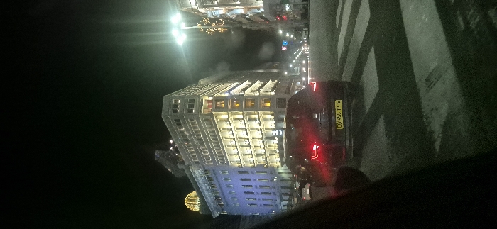 A tilted nighttime shot displays a brightly lit, multi-story building with illuminated windows