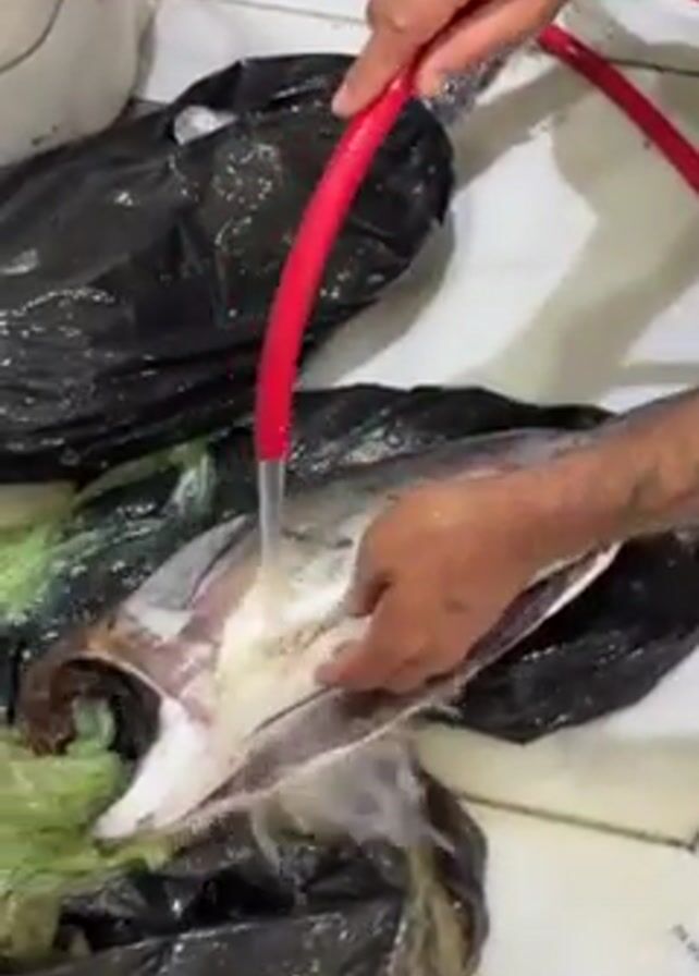 A person wearing black sandals is washing a large, gutted fish with a red hose in a room with white tiled floors. The person has tattoos on their right arm and is surrounded by black and green plastic bags. The water from the hose is running over the fish, cleaning its insides. The fish is lying on a plastic bag.