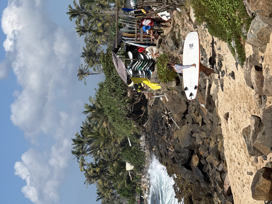 A coastal scene shows a person posing on a surfboard atop rocky terrain. The surfboard is predominantly white with black accents. Behind the person is a lush, tropical landscape with palm trees. Surfboards are stacked nearby, suggesting a rental or sales location. A vibrant blue sky with fluffy white clouds provides the backdrop, contrasted by the rugged coastline and crashing waves.
