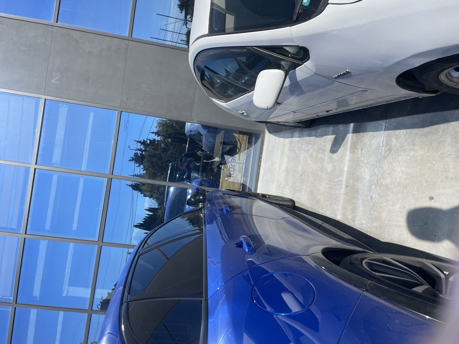 The image depicts an outdoor scene in Tbilisi, Georgia, specifically at a Kursi Auto facility. In the foreground, two vehicles are parked on light gray concrete paving under bright sunlight. On the left, the rear-left portion of a dark blue SUV is visible, featuring a prominent fuel cap on the fender, a black wheel arch, and a multi-spoke black alloy wheel. Its windows are darkly tinted. On the right, the front-right portion of a white car, likely a hybrid hatchback (e.g., Toyota Prius), is visible. It features a white side mirror, a rain deflector on the front window, and a silver alloy wheel. Distinct shadows are cast on the ground by both vehicles and an unseen individual in the lower left. In the background, a modern building facade is visible, constructed primarily of large, square, blue-tinted reflective glass panels framed by dark gray mullions. A wide vertical gray panel or column runs along the right side of the building facade. The glass reflects a clear blue sky, green trees, and other vehicles. Prominently reflected in the central glass panel is a sign with Georgian text "კურსი" (Kursi) and "AUTO" below it, identifying the business. The reflection also shows a person (likely the photographer) holding a phone.
