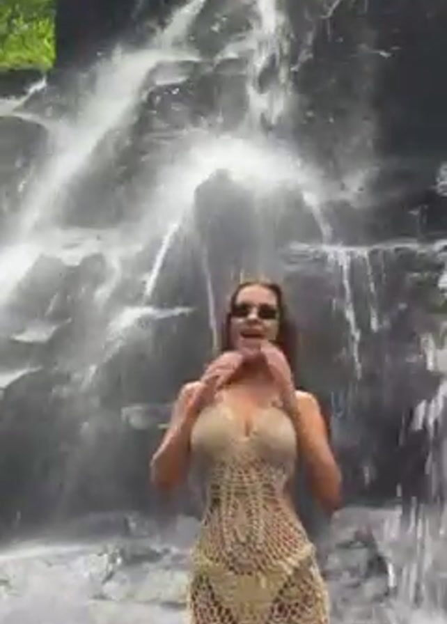 A woman in sunglasses stands in front of a multi-tiered waterfall. She wears a crochet-style dress over a two-piece bathing suit. She initially adjusts the top of the dress. Then she lifts her arms overhead, smiles, and turns to her left, facing away from the camera. The environment is lush and green, with the waterfall cascading down dark rocks.