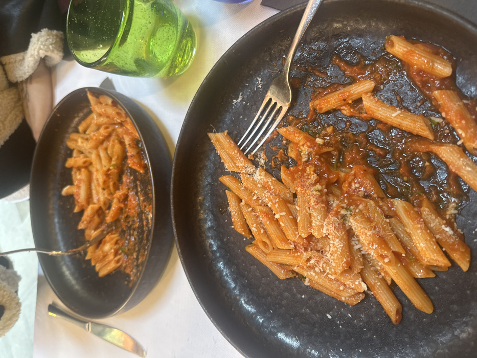 The image displays a close-up, high-angle view of a dining table in an indoor setting, consistent with a restaurant in Venice, Italy. Two dark, round ceramic dishes containing penne pasta with red marinara sauce and grated white cheese are central. The foreground dish, partially consumed, holds multiple pieces of penne pasta coated in sauce and cheese, with a silver four-tined fork resting on its right side. The background dish contains a larger quantity of similar pasta, with a silver fork actively immersed, suggesting ongoing consumption or serving. To the left of the background dish, a silver knife is positioned on a white tablecloth. To the right, a textured, iridescent green glass tumbler containing a clear liquid is visible. A person's hand holding the fork in the background dish and blurred elements of another person or object are partially visible in the upper frame. The table is covered by a crisp white tablecloth.