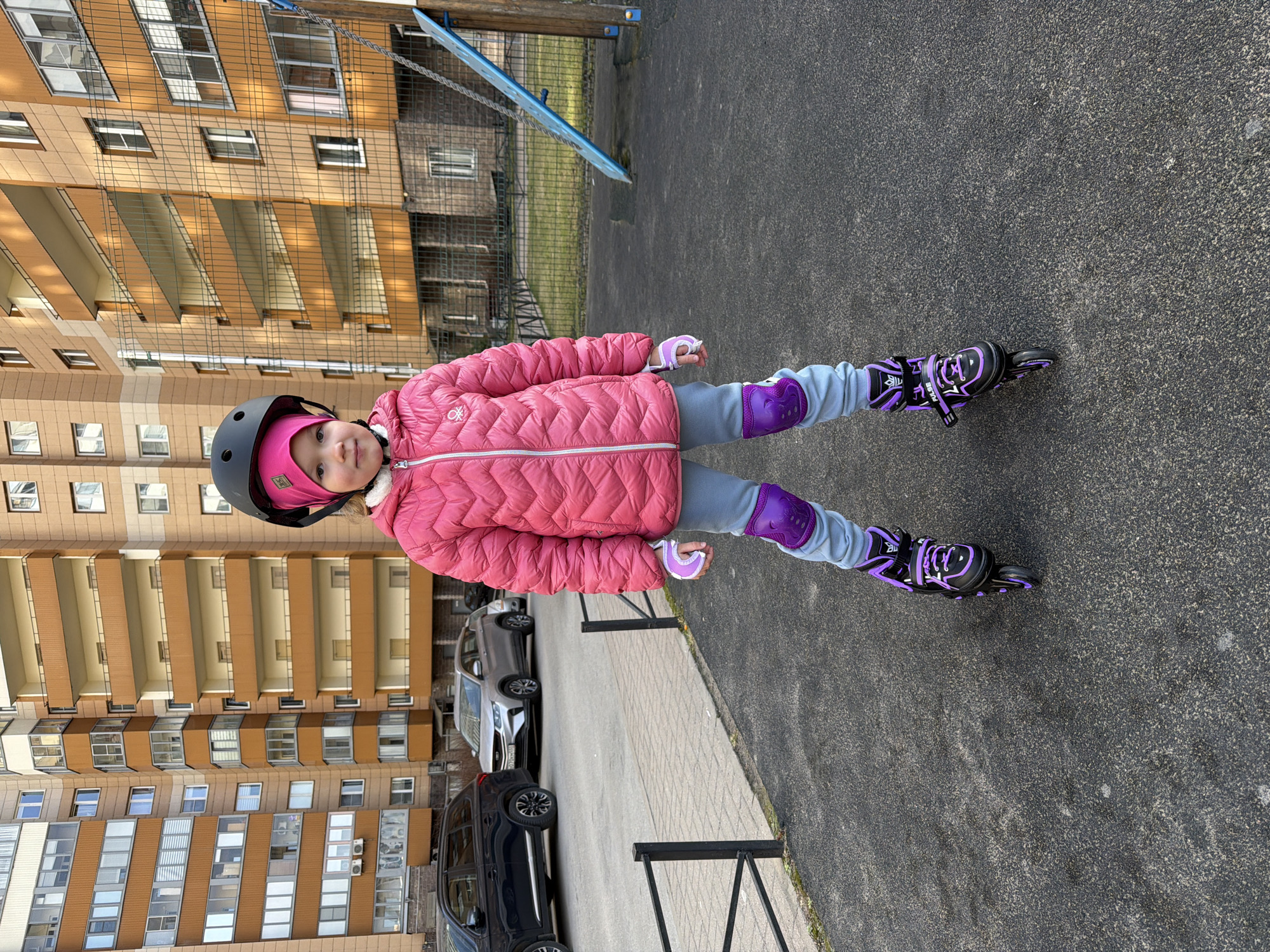 A young girl stands centrally on dark asphalt pavement in a residential area of Murino, Russia, facing the viewer directly. She is wearing a black helmet over a pink beanie, a pink quilted puffer jacket with a white zipper and "UNITED COLORS OF BENETTON" logo, light blue pants, pink and white fingerless gloves/wrist guards, purple knee pads with a bear motif, and black and purple inline roller skates branded "PULSE." In the background, a multi-story apartment complex with beige and orange-brown facades and numerous windows and balconies occupies the left and center. To the left of the girl, beyond a low black metal railing and a grey sidewalk, a paved street shows a dark blue SUV and a silver Geely Coolray/Atlas Pro SUV with Russian license plate "O70CMM 178" parked. To the right, a chain-link fence separates the foreground from a grassy area and another building. Part of a playground structure, including a wooden post and a slanted blue panel, is visible on the far right. The scene is illuminated by daylight, with no visible snow.