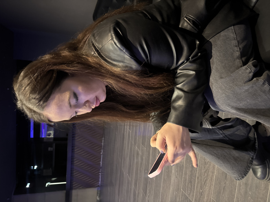 The image displays a female individual, seated and looking down at a smartphone in a dimly lit indoor environment. She has long brown hair and is wearing a black leather jacket, dark grey wide-leg jeans, and dark platform shoes. A metallic nose stud is visible on her left nostril. She holds a light pink-cased smartphone with both hands, actively interacting with its screen. The background features a dark, wood-like tiled floor and a horizontal wooden bar or counter structure with vertical slat detailing. Beyond this counter, the area is dark with faint ambient blue and white lighting fixtures, suggesting a lounge or entertainment venue. The specific location within the city of Khimki, Russia, cannot be determined from the visual evidence provided.