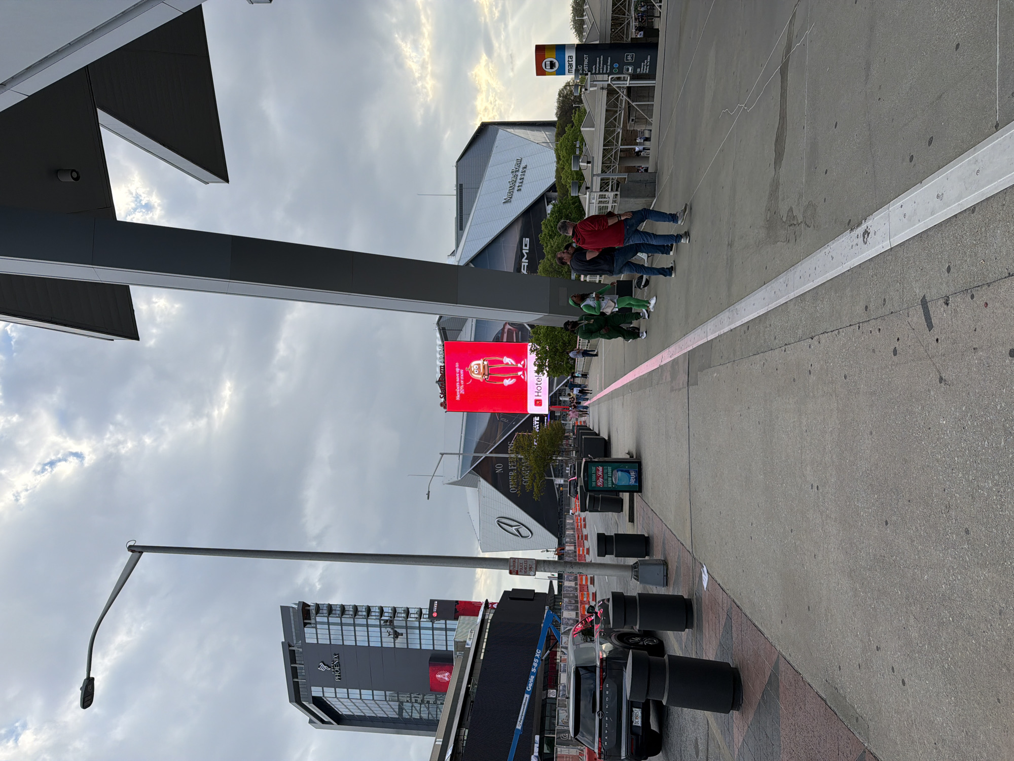 The image captures an urban scene, likely in Atlanta, United States, based on visible landmarks. Mercedes-Benz Stadium is prominent, adjacent to State Farm Arena. Pedestrians are walking along a pink line marked on the sidewalk near the stadium. Various signs are visible including, Mart, Phoenix, and other commercial advertisement. A street light is located in the foreground. The sky appears cloudy. There are some barricades on the sidewalk.