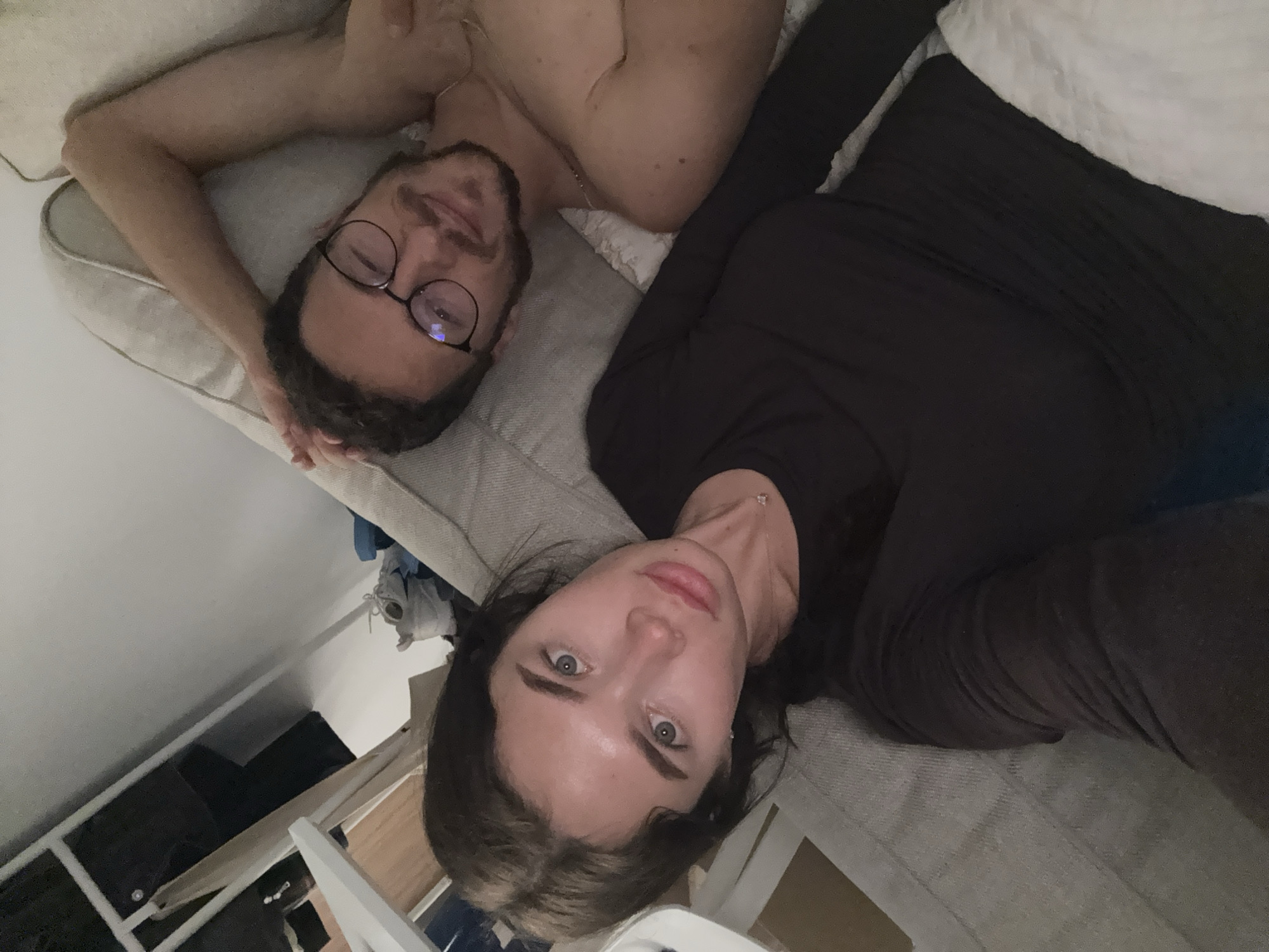 - "Two individuals are lying on a light gray upholstered surface, likely a sofa or bed" by FM-KEr2A3, licensed under CC BY 4.0