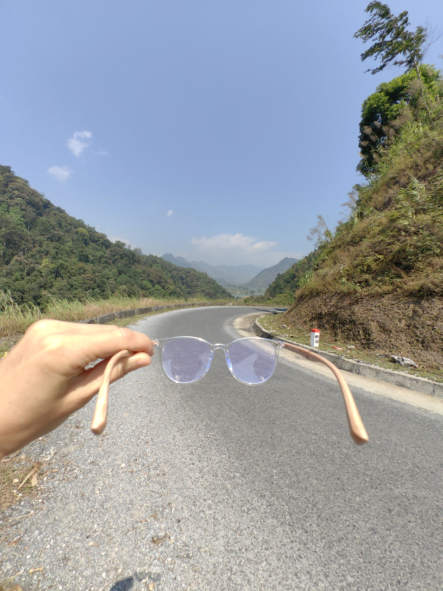 hand holding a pair of eyeglasses in front of a winding road. The road is paved and surrounded by lush green hills and mountains. The sky is clear and blue. A signpost marked "H1 53" is visible on the side of the road. The location is Lùng Tám Commune, Vietnam.