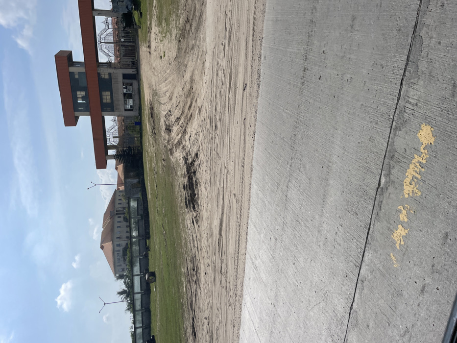 The image depicts an outdoor scene in Igando Oloja, Nigeria, under a bright, partly cloudy sky. In the immediate foreground, a grey concrete surface, possibly a road or paved area, exhibits faint yellow paint markings and a dark, indistinct object at the bottom edge. Beyond this, a wide expanse of disturbed sandy terrain shows numerous vehicle tire tracks and patches of green grass. Lying on the grassy section to the left are several large, dark, circular objects, possibly industrial tires or spools. In the mid-ground, a prominent multi-level gateway structure dominates the right side. It features a concrete base, an elevated control or observation room with an orange facade, and ornate metal gates that appear closed. A blue waste receptacle is visible near the base of the gate on the left side. Behind this gateway, a building with a reddish-brown tiled roof is partially visible. Further left in the background, another large, multi-story building with a light-colored facade and a matching reddish-brown tiled roof stands behind a low fence or wall. Two streetlights with multiple fixture heads are positioned in the background. No individuals are present in the scene, and no overt actions or interactions are depicted.