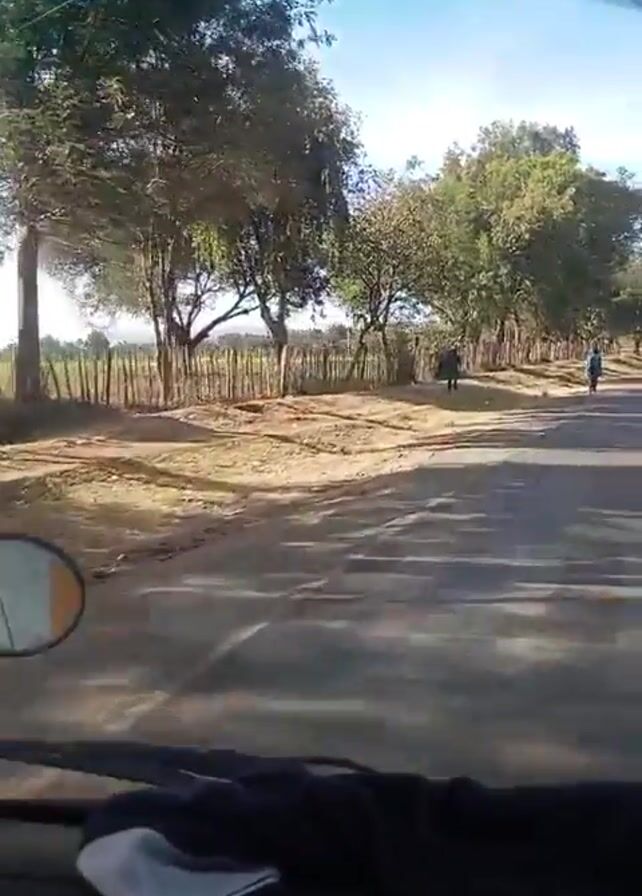 view from the inside of a moving vehicle, likely a car, looking out towards a rural landscape. A person is walking along the side of the road, and another person is walking further away on a bicycle. A white SUV is seen briefly at the start of the video as the vehicle begins to move. Trees line the side of the road, bordering a field enclosed by a rustic fence. The sky is blue with scattered clouds, indicating a sunny day. The road is paved and appears relatively empty. The camera is stable, providing a clear view of the scenery as the vehicle progresses.