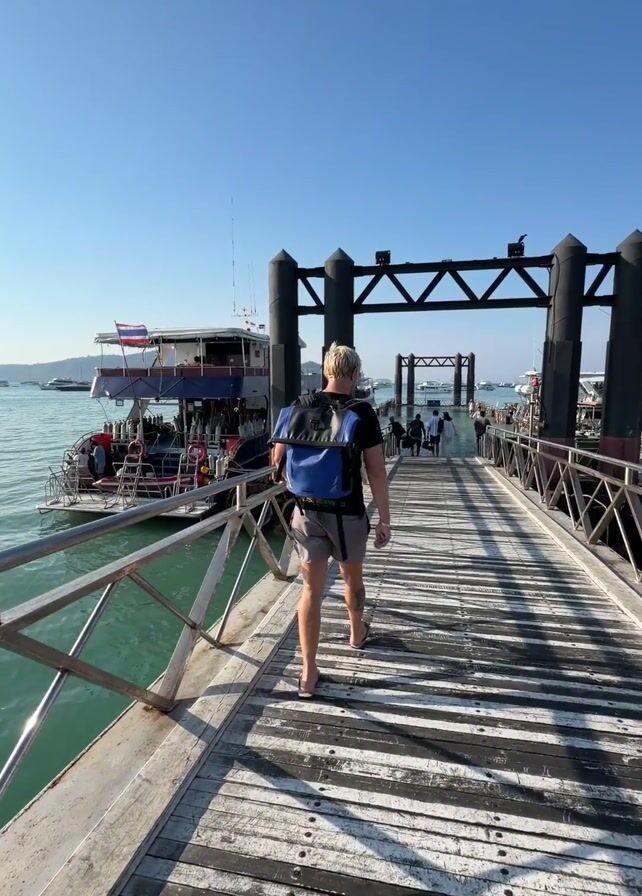 A person walks away from the camera down a pier on a sunny day. The person is wearing a dark t-shirt, grey shorts, and a blue backpack. They are walking barefoot and appear to be fair-skinned with short blonde hair. The pier is made of planks painted in alternating white and black stripes and has metal railings on either side. The ocean is visible on the left side of the pier, and a boat with a Thai flag is docked there. In the distance are other people walking on the pier and more boats floating on the water. Overhead, there is a black metal structure. A yellow sign with black lettering is mounted to the railing on the left side of the pier. The sky is clear and blue.