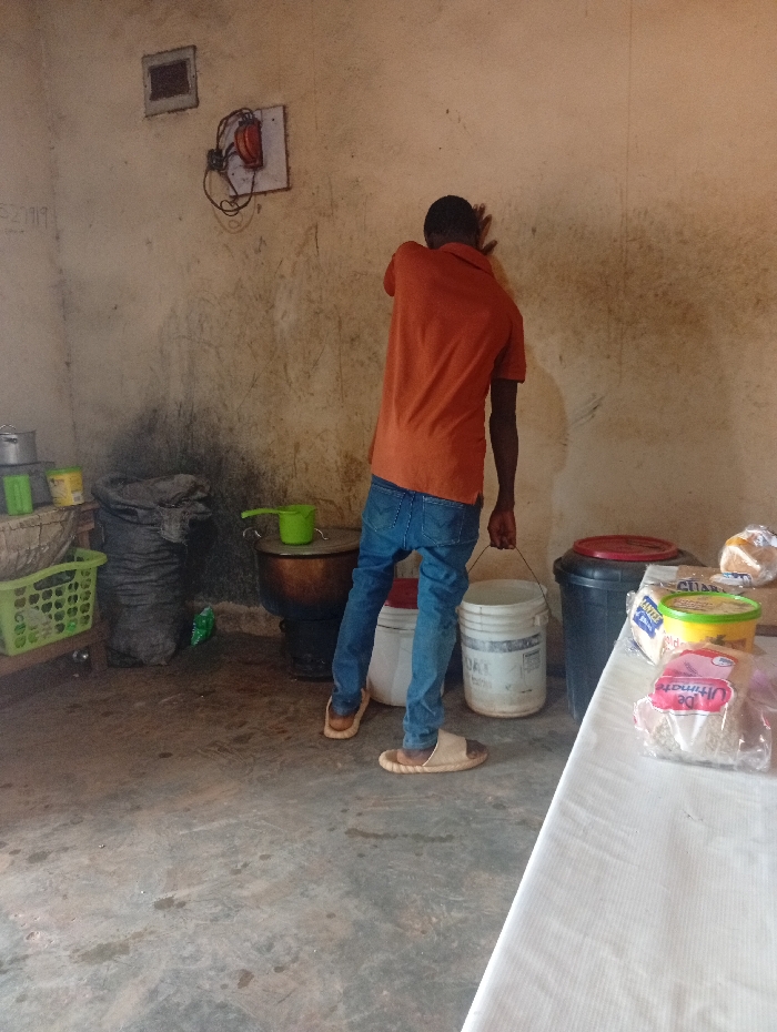 Inside a worn room, a man in a red polo shirt, blue jeans, and sandals stands facing a dirty wall, his hand pressed against it. To his left, there's a green basket, a sack, and a pot. To his right, buckets and packaged goods sit on a table. Electrical fixtures are visible on the wall. The room appears to be a kitchen or storage area, with signs of use and wear throughout.