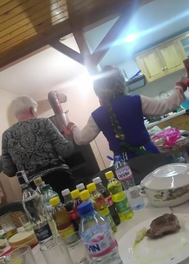 several women dancing to music at what appears to be a celebratory event. They are holding hands, and some are wearing traditional attire. A table in the foreground is covered with bottles of drinks, glasses, and leftover food. The room has a rustic feel, with a wooden ceiling and beams, and a wood-burning stove is visible in the background. The lighting is somewhat harsh, with a bright light source causing glare.