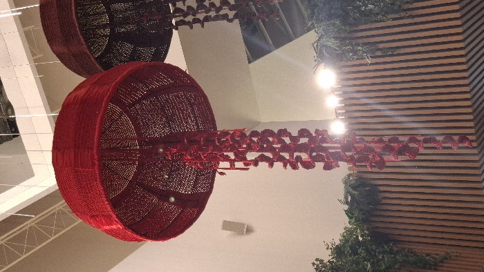 An interior view features two large, woven spherical pendant lights, one red and one dark brown, hanging from the ceiling. Both have cascading red tassel-like decorations. One is positioned at the top left of the frame and the other is in the foreground. To the right is a slatted wood wall with lush greenery growing from its base. Overhead lighting fixtures emit a bright glow.