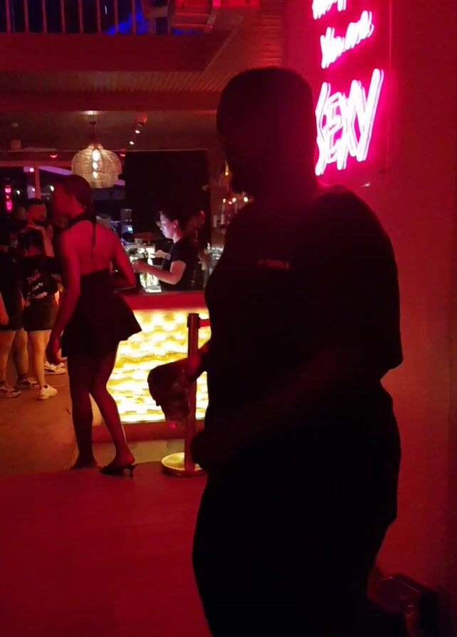 dimly lit interior space, possibly a bar or club, with a red neon sign on the ceiling. Several people are visible, including a person standing near the camera and others gathered further inside. The lighting is primarily red, with some areas appearing darker. There are stairs visible in the background. The camera angle is somewhat unusual, looking upwards.