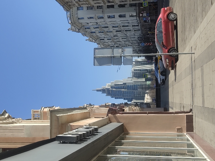 The image depicts a street scene in Moscow, Russia. A red car is parked on the side of the road, with a blue car parked behind it. A modern skyscraper is visible in the background, along with other buildings with classical architecture. The sky is clear and blue. The street is paved with light-colored tiles. There are traffic signs above the parked cars. In the foreground, part of a building with a glazed facade is visible.