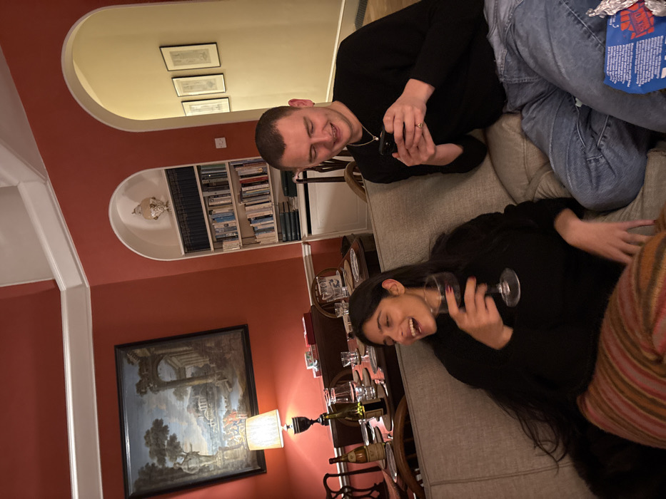 Two people are lounging on a grey couch in a red-walled room. One person is a man with short hair, wearing a black shirt and jeans, holding a phone. The other is a woman with long hair, wearing a black sweater and holding a wine glass, laughing. A table laden with wine bottles and glasses sits nearby. A painting hangs on the wall, and a bookshelf is visible. The overall atmosphere is jovial and relaxed.