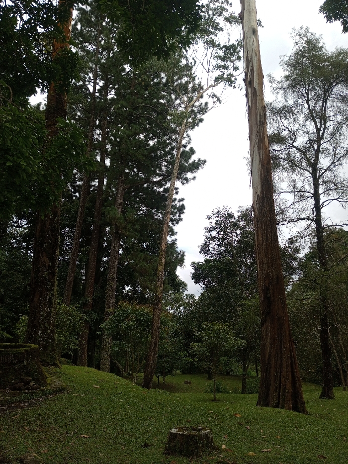 The image depicts an outdoor arboreal landscape situated in Padegaon, India, under an overcast sky. The foreground and mid-ground are covered by an uneven expanse of short, green grass. A cylindrical tree stump, approximately 30-40 cm in height and diameter, is centrally located in the immediate foreground, exhibiting moss and lichen growth. To the far left, a larger, lower, moss-covered, and decayed wooden or stone structure is partially visible. The scene is dominated by numerous trees of varying heights and species. A very tall, slender tree with light, peeling bark showing streaks of tan and brown occupies the right side of the frame, extending vertically towards the sky. To its left, a dense cluster of tall trees with dark, rough bark and dark green, needle-like foliage are visible, indicating coniferous species. Below the main canopy, a layer of smaller trees and dense green shrubbery forms the undergrowth. Patches of light grey, overcast sky are visible through gaps in the tree canopy in the upper portion of the image. No human subjects, animals, or specific actions are observed.