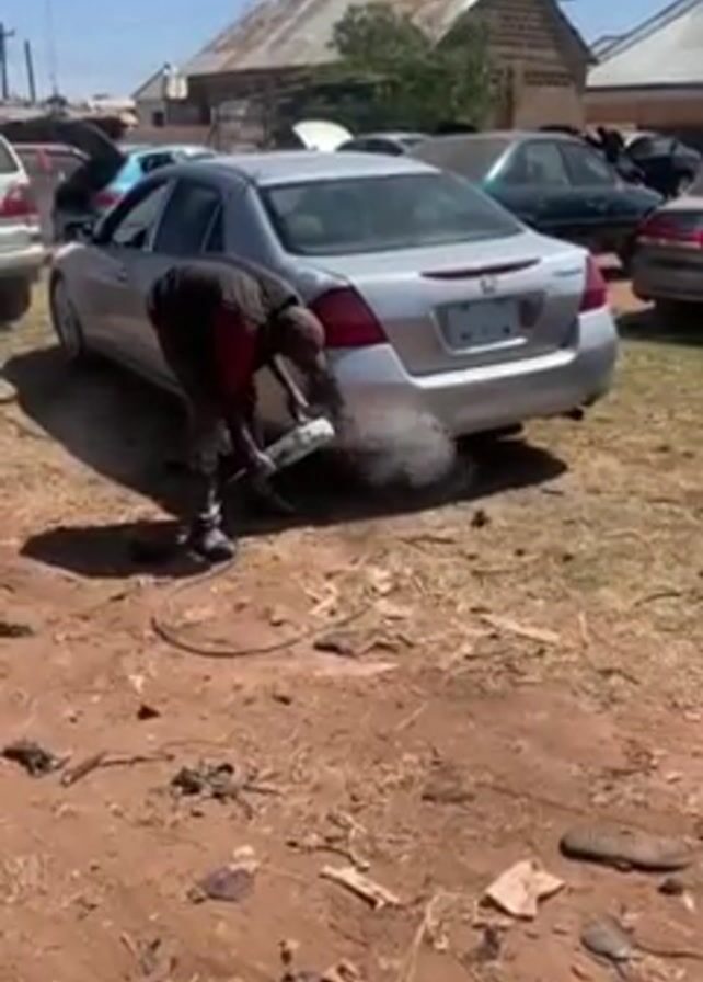 man working on a silver Honda Accord in a car junkyard. The man is using a handheld sandblasting tool to remove rust and old paint from the rear of the car, producing a cloud of white dust. The car is surrounded by other cars in various states of disrepair. The ground is dirt with various debris scattered around. The sky is clear and blue.