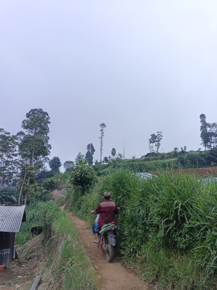 The scene depicts a rural, hilly landscape in Pinnwe, Myanmar (Burma), under an overcast, light grey sky. A narrow, unpaved dirt path, approximately 1.5 meters wide, ascends through the central portion of the frame, curving slightly rightward. An adult male, wearing a maroon long-sleeved shirt and a light-colored cap, operates a dark-colored utilitarian motorcycle, seen from behind. A passenger, wearing a blue garment, rides on the back of the motorcycle. Dense green grass and various shrubs line both sides of the path, with particularly tall, thick grass forming a barrier on the right. On the far left, a small, rustic structure with a corrugated metal roof is partially visible below the path level. The background features rolling hills covered in trees of varying heights, including several tall, slender trees with foliage clustered at their crowns. In the mid-ground and distant hills, cultivated agricultural terraces are discernible, with some areas appearing to be covered by white plastic sheeting.