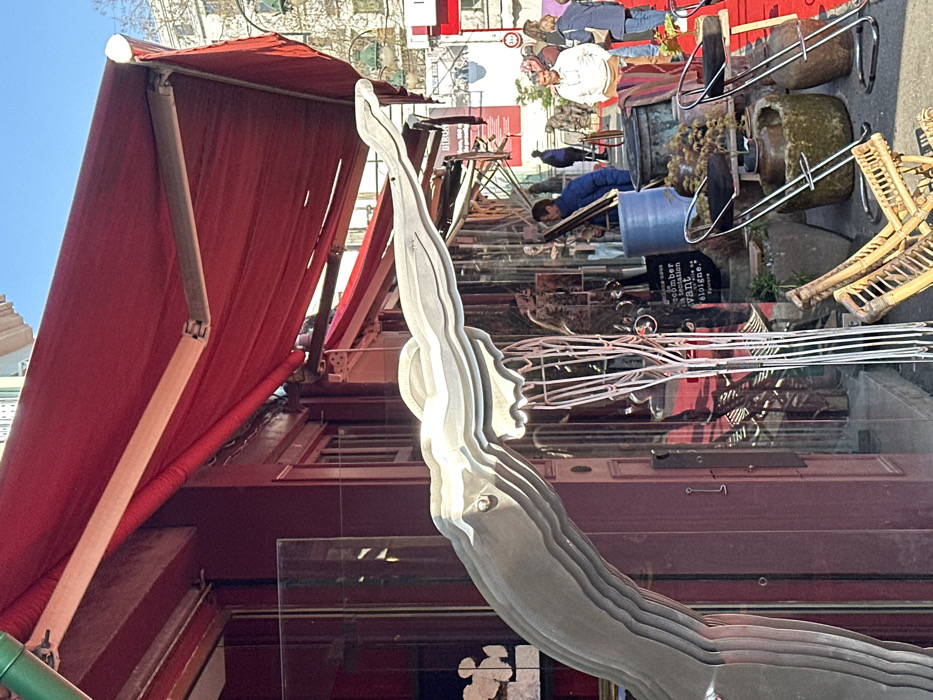The image depicts an outdoor street scene in Saint-Ouen-sur-Seine, France, characterized by an antique or flea market atmosphere under clear skies. In the immediate foreground, to the left and center, a multi-layered, stylized sculpture of a human figure in a diving or swimming posture is prominent. This sculpture is light-colored, possibly metal or composite, and appears to be suspended or attached to the exterior of a building, partially obscured by a clear glass panel. Behind the sculpture, a building with a dark red or maroon facade features multiple windows and a large, extended red fabric awning overhead, casting shadows. Through the glass facade, various items are visible inside the establishment, consistent with an antique shop or gallery. To the right of the sculpture and extending into the midground, a collection of diverse objects is displayed outdoors on what appears to be a red rug or carpet laid on the pavement. These objects include metal-framed bar stools with dark seats, large ceramic or stone pots, a blue barrel, and various smaller items. A light-colored, open-weave rattan chair or furniture piece lies on its side in the lower right foreground. Several individuals are present in the midground and background. One person, wearing a blue jacket, is observed bending over near the blue barrel. Further back, a man in a white sweatshirt is visible, along with multiple other indistinct figures walking or standing. The street surface beyond the displayed items appears to be asphalt or similar paving. In the background, other buildings with varying architectural styles and colors are visible, including what appears to be a light-colored, multi-story structure. Distant trees and elements of city infrastructure, such as light posts, are also discernible. The scene is brightly lit by natural sunlight, indicated by distinct shadows.