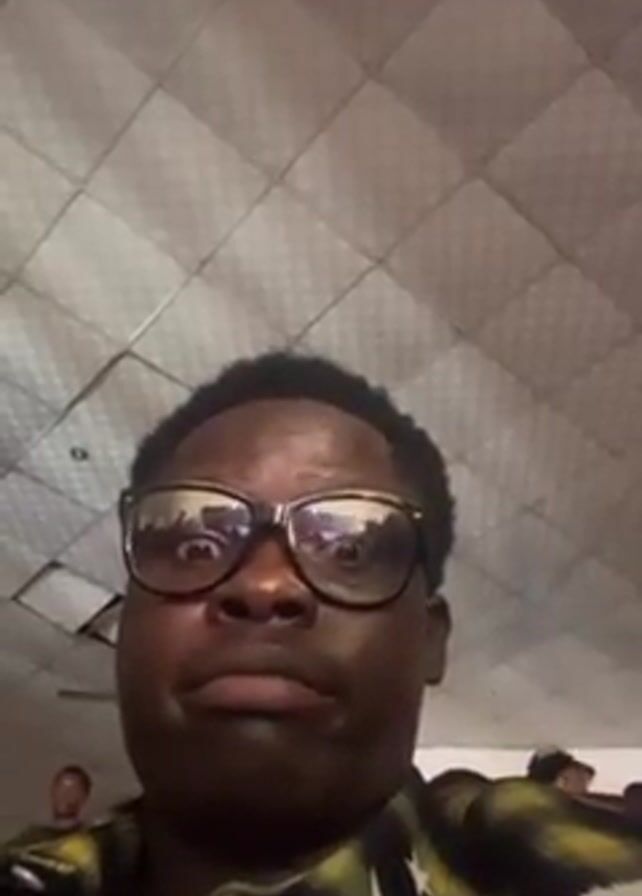 young, dark-skinned person wearing glasses and a yellow and green plaid shirt in an auditorium or theater setting. The person looks up into the camera, at first with pursed lips, then slightly opens their mouth. They appear to be in a seated position, and other people are visible behind them. The room has rows of red seats, and the ceiling has square panels. The overall environment suggests a public gathering or performance. There is no significant interaction or action besides the person’s minor facial expressions.