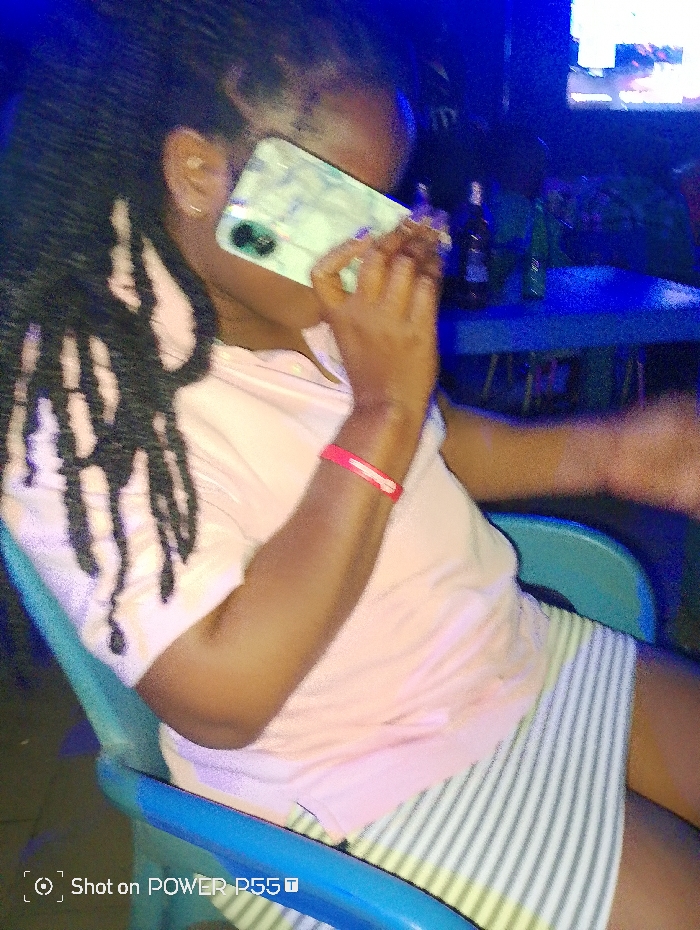 A woman with long, dark hair is holding a marble-patterned smartphone up to her ear. She's wearing a light pink shirt, a gray and white striped skirt, and a pink bracelet. She's seated on a teal plastic chair. A table is visible in the background with bottles on it, under blue lighting. "Shot on POWER P55T" is displayed at the bottom of the image.