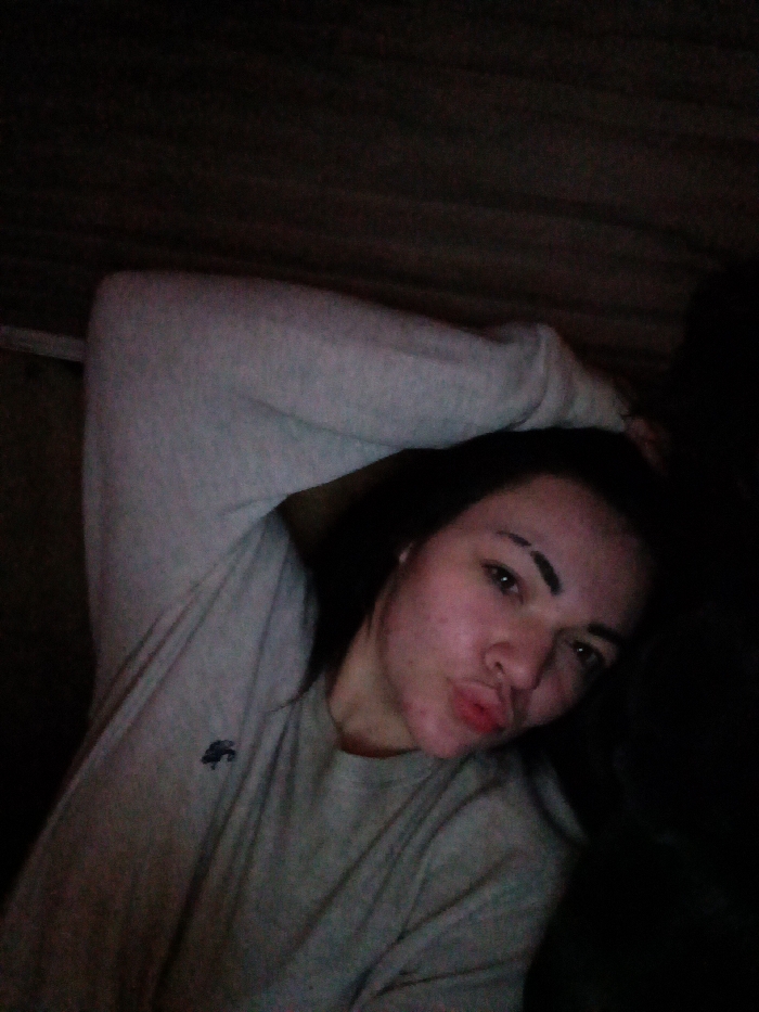 An individual, appearing female, is depicted indoors in a dimly lit environment. The subject is in a reclined position, facing the camera with a direct gaze and pursed lips. She wears a light gray long-sleeved crew-neck shirt with a dark, embroidered emblem on the left chest. Her right arm is bent, with the hand positioned near the upper head/neck region. Her left arm extends towards the lower-left portion of the frame. The subject has dark hair, prominent dark eyebrows, and visible blemishes on her face. The background is dark and indistinct, showing textured surfaces consistent with an interior setting, possibly wood or fabric. No visual information within the image identifies the specific location as Ozark, United States.