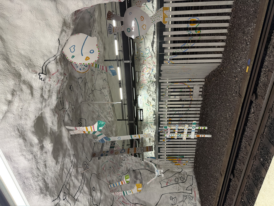 This image depicts the Hallonbergen metro station in Sundbybergs kommun, Sweden. The scene is an underground platform characterized by exposed, roughly textured rock walls and ceiling, painted white and extensively covered with black line drawings of abstract figures, including an elephant-like shape on the left, and numerous smaller, colorful scribbles and patterns. Suspended from the ceiling are multiple handcrafted, decorative cardboard cutouts. These include several elongated, striped forms resembling socks or boots with heart motifs, a large circular piece with a simplified face design, and a stylized, multi-segment ladder-like structure, all adorned with bright colors, stripes, and hearts. A white vertical picket fence separates the track area from the rock wall. Within the fenced-off area, dark gravel covers the ground, and a smaller, decorated ladder-like object stands upright. Beyond the fence, a black rectangular sign with white text reads "Hallonbergen" and "Utgång" (Exit). The tracks themselves are visible in the foreground, laid on dark gravel ballast. Overhead, a horizontal structure supports fluorescent lighting fixtures illuminating the area. No individuals are present in the frame.