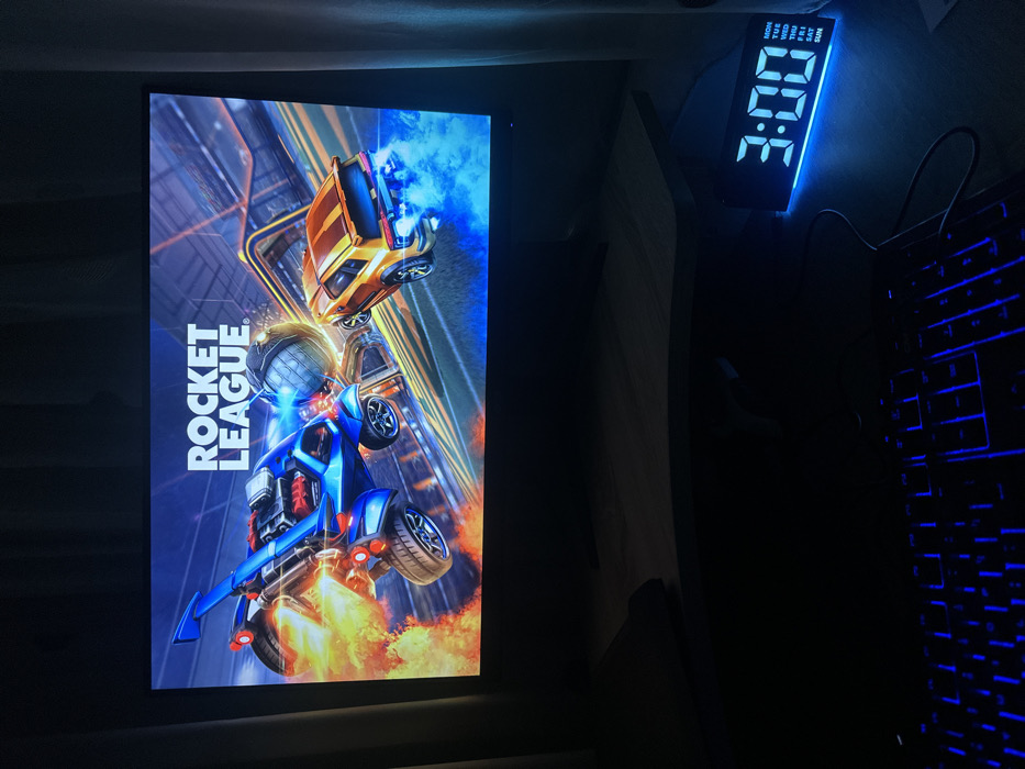 This image depicts a dimly lit indoor gaming setup located in Harmanli, Bulgaria, captured during the early morning hours. The central focus is a large computer monitor displaying the title screen for the video game "Rocket League." The screen shows two stylized vehicles, one blue and one orange, mid-air with visible booster flames, alongside a large spherical game ball within an arena environment. Below the monitor, a light-colored wooden desk surface is visible. On the desk to the left, a black computer keyboard with blue backlighting is present. To the right of the keyboard, a black digital alarm clock with a blue LED display shows "3:00" and the abbreviated days of the week, with "MON" appearing active. A dark cable extends from the clock. A black computer mouse is partially visible on the desk, behind the keyboard on the left side. The room's illumination primarily originates from the monitor, keyboard backlighting, and the clock display.