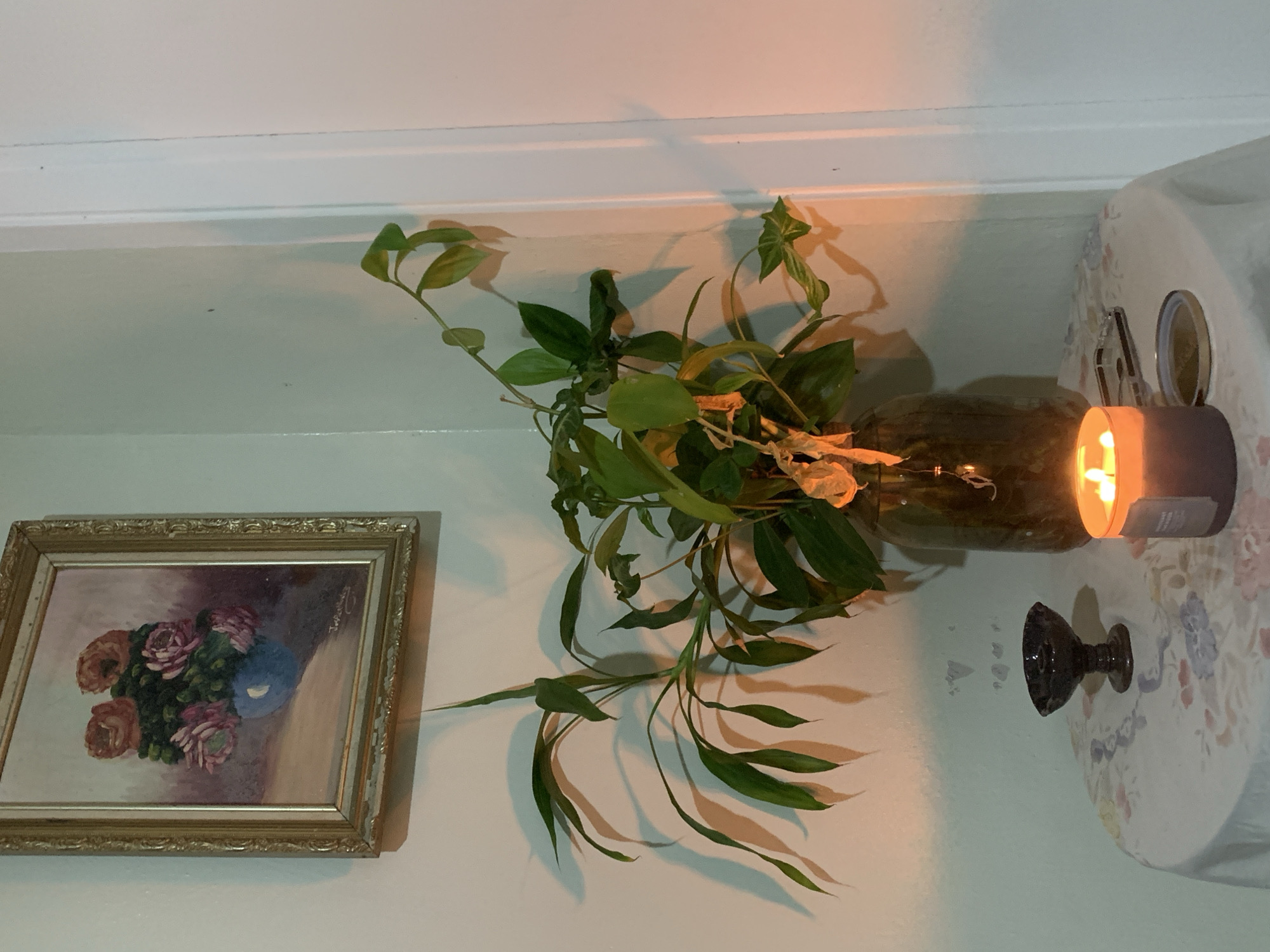 A framed floral painting hangs on a light-colored wall, adjacent to a vase of green plants placed on a small, round table with a floral patterned tablecloth. A lit candle is positioned on the table near the vase. The scene is illuminated by warm light, possibly from the candle and/or an unseen light source. No people are visible. There is no information to suggest this image was taken in La Tagua, Venezuela.