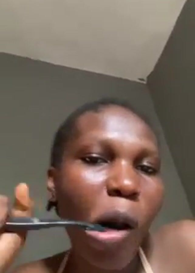 A woman is vigorously brushing her teeth with a dark toothbrush