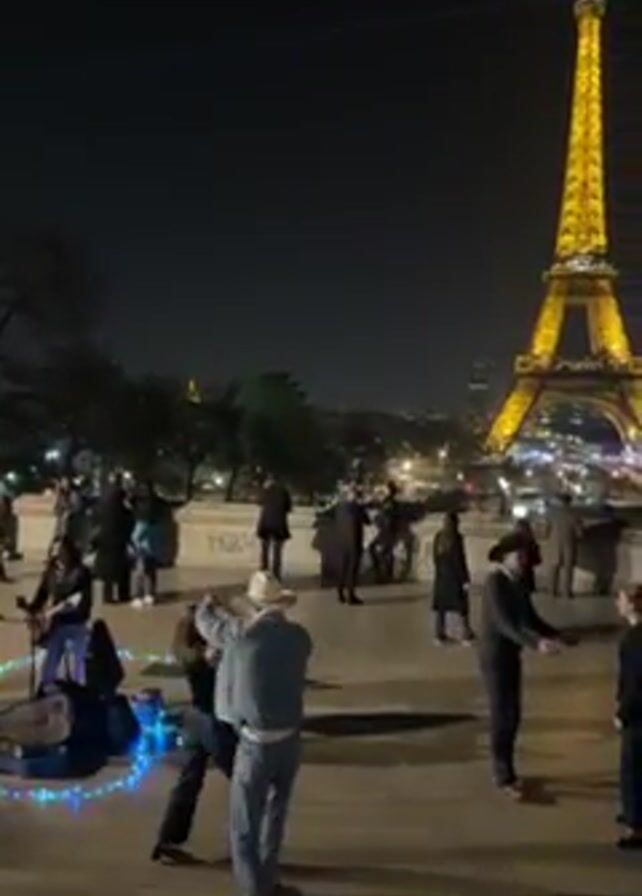 The video captures a nighttime scene near the Eiffel Tower in Paris. The tower is illuminated in the background. In the foreground, several people are gathered, some appearing to be dancing to music being played by a guitarist who is kneeling on the ground surrounded by lights. There are other people standing around watching. The night sky is dark.