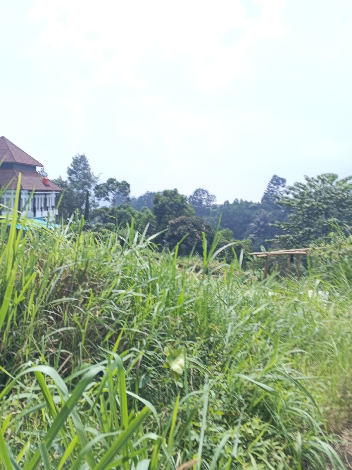 A tranquil, verdant landscape features tall, vibrant green grass in the foreground, partially obscuring a rustic wooden structure in the midground. Beyond the grass, lush trees and foliage populate the distant hills, creating a dense forest backdrop under a pale, overcast sky. The edge of a building with a distinctive roof is visible on the left, adding a touch of civilization to the otherwise natural scene.