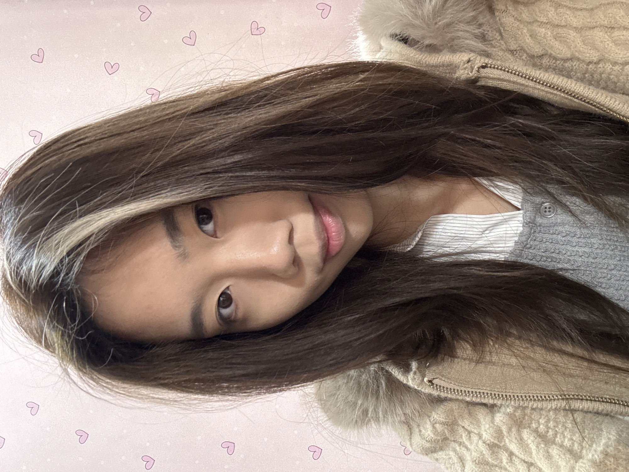 A young Asian woman with dark brown hair, a streak of blonde near her forehead, is angled towards the camera