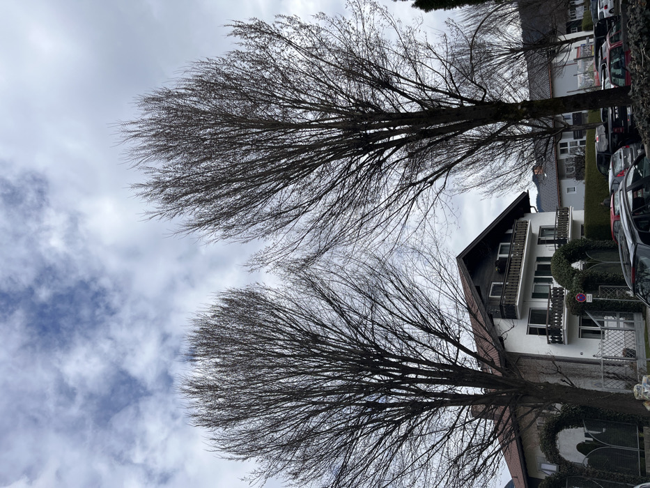 The image captures an urban street scene in Garmisch-Partenkirchen, Germany, under an overcast sky with patches of visible blue. Two prominent, tall, bare deciduous trees, devoid of leaves, dominate the foreground and midground. Behind the left tree stands a multi-story residential building featuring a white facade, a dark brown gabled roof, and multiple balconies with dark wooden railings. Green window shutters are visible on the lower-level windows. In front of this building, a metal fence with two arched, ivy-covered trellises marks the property line. A circular regulatory sign is positioned near the fence. A street in the midground is lined with parked vehicles, primarily passenger cars of various colors and models. Further in the background, additional residential structures and bare trees are visible. No individuals are clearly discernible within the frame.