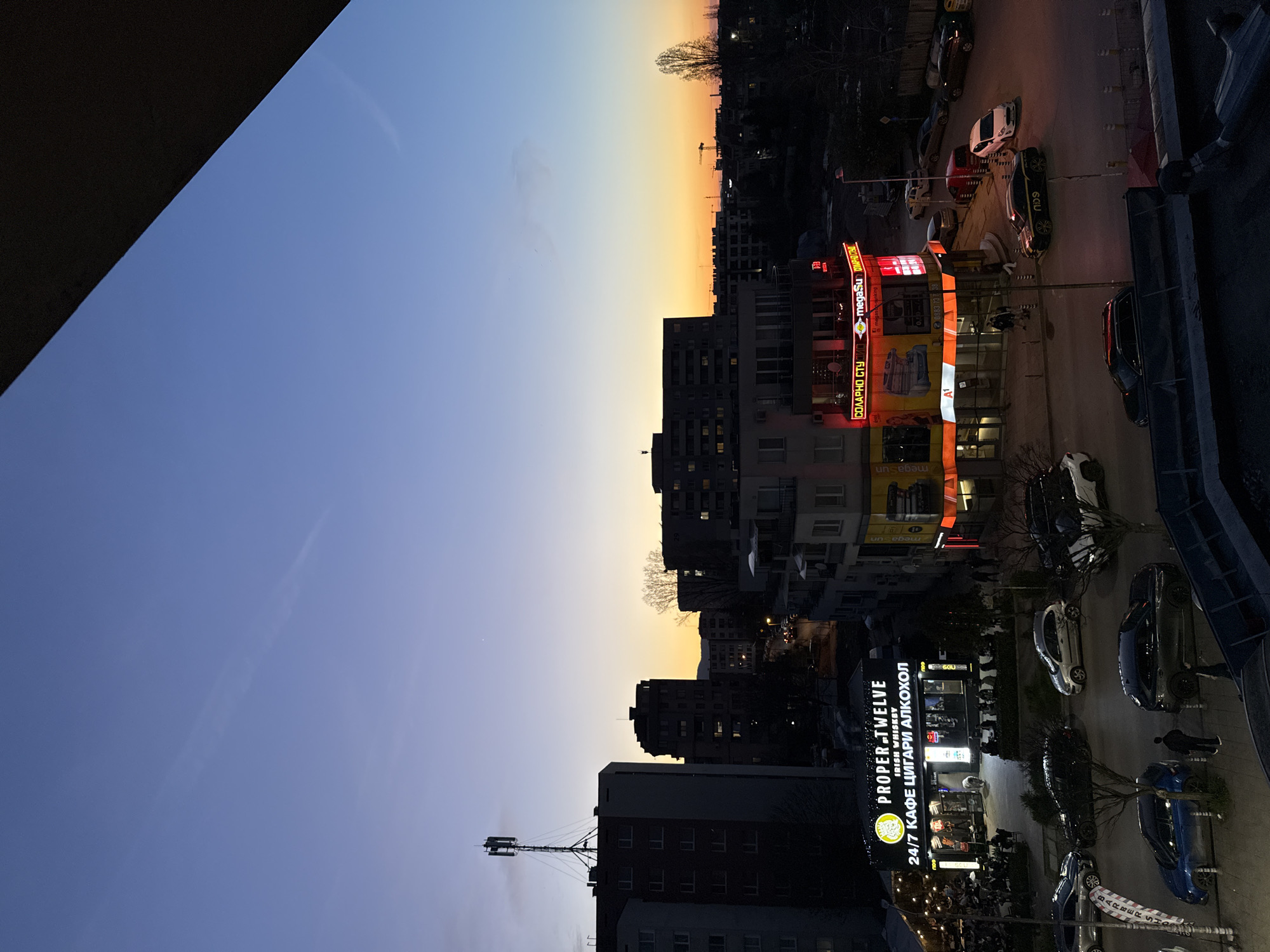The image depicts a nighttime cityscape in Sofia, Bulgaria, featuring illuminated buildings and street scenes. Prominent signs indicate businesses such as "PROPER TWELVE Irish Whiskey 24/7 КАФЕ ЦИГАРИ АЛКОХОЛ" and "megasun SOLARNO STU." Cars are parked along the street, and a few pedestrians are visible. The sky transitions from blue to orange, indicating either sunrise or sunset. A construction crane can be seen in the background skyline.
