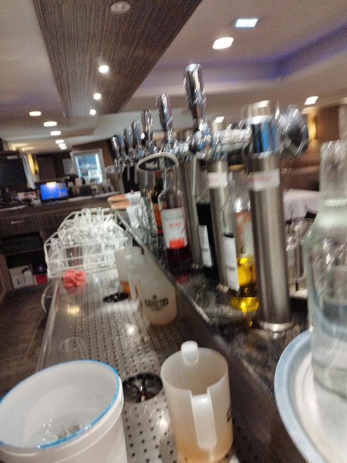 The image depicts the interior of a commercial establishment, likely a bar or restaurant, located in Strasbourg, France. The primary focus is a stainless steel bar counter featuring a drainage mat. In the foreground, a white plastic bucket with a light blue rim, partially filled with ice and water, is visible on the left. To its right, a translucent white plastic pitcher containing an amber liquid rests on the bar mat. The midground showcases a row of approximately seven chrome-plated beverage taps, likely for beer or other dispensed drinks, extending across the counter. Behind these taps, several bottles are present, including one clearly labeled "Grenadine VOUGI" with red liquid, and another containing a clear yellow liquid. To the left of the taps, a white plastic rack holds multiple inverted clear glass drinking vessels, suggesting they are air-drying. A crumpled red fabric object is also on the counter near the glassware. The bar surface beneath the taps appears wet or reflective. In the background, a dark wooden bar counter with a computer monitor displaying a blue screen is visible on the left. Further into the background, indistinct tables with white tablecloths can be seen. The ceiling features a textured, ribbed pattern in brown, with several recessed circular light fixtures providing illumination. The overall lighting is bright and even. No individuals are visible in the scene.