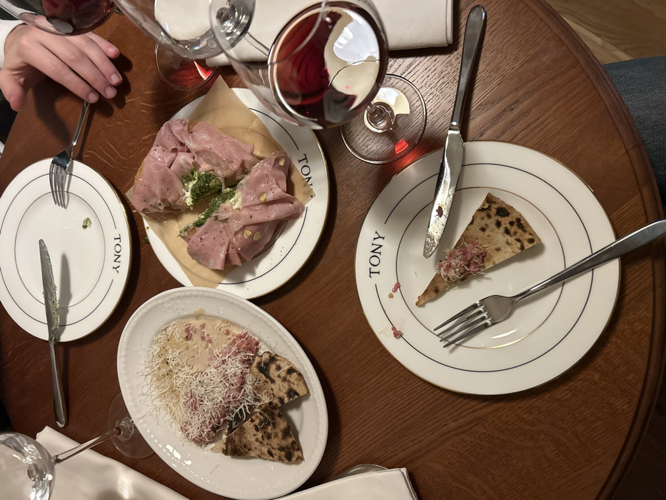 The image displays an overhead view of a wooden dining table set for a meal at a restaurant identified by "TONY" branded plates, consistent with a "Tony" restaurant location in Dnipro, Ukraine. Three plates of food are visible on the table. In the upper left, an oval white plate contains a dish resembling beef tartare, topped with a generous layer of grated white cheese and a lighter sauce, accompanied by two pieces of charred flatbread. To its right, a round white plate with a gold rim and "TONY" in black text holds folded slices of cured meat, consistent with mortadella, topped with a green pesto-like substance and chopped pistachios, resting on a square of parchment paper. A person's hand, with a visible wrist, is positioned above this plate, holding a fork. In the lower center, a third round white plate, also with "TONY" branding, contains a single triangular piece of charred flatbread topped with a similar tartare mixture and grated cheese. Red crumbs are scattered on this plate. Beverages include a clear wine glass containing water in the upper left, and two red wine glasses positioned on the right side of the table, one prominently in the mid-right, partially filled with red wine. Cutlery consists of forks and knives, with some exhibiting minor food residue. A folded white napkin is partially visible on the far left. A person's lap, clad in blue jeans, is partially visible at the bottom right, indicating another diner present at the table.