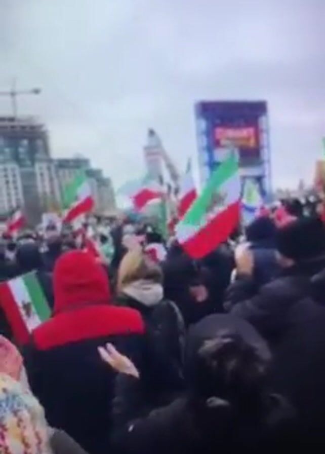 crowd of people in an outdoor setting, likely a city street. The majority of individuals are facing away from the camera, and many are waving Iranian flags. People are wearing winter clothing, suggesting a cold climate. A large electronic billboard stands in the background, displaying information, although the exact content is not clear. There is at least one crane visible near a tall building. Some people are clapping their hands. The sky appears overcast. The overall scene indicates a protest or demonstration of some kind.
