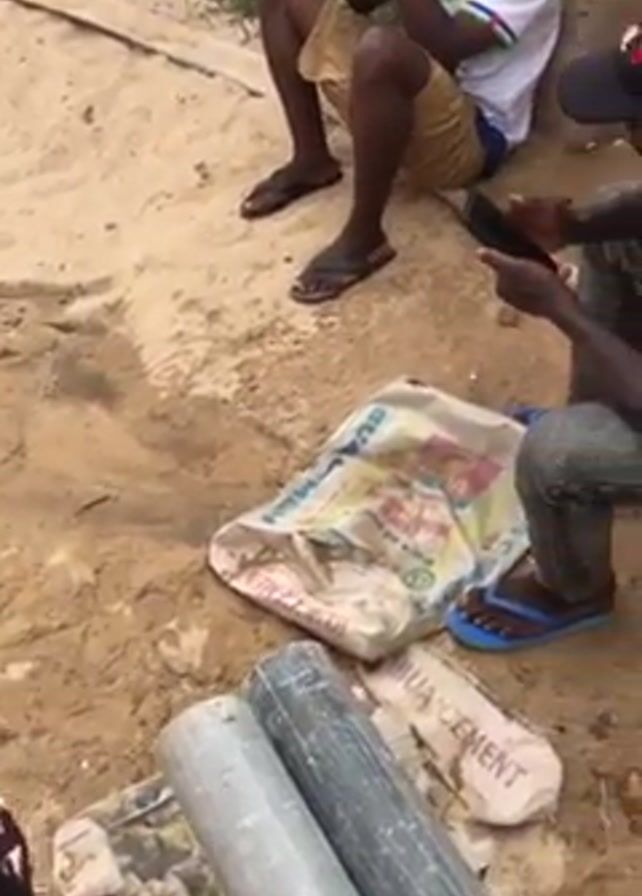 group of men sitting on a sandy ground. There are two bags labeled "cement", two pipes, and loose sand on the ground. One man is looking at a phone. The men are wearing casual clothing including sandals and a baseball cap. The background includes what appears to be debris.