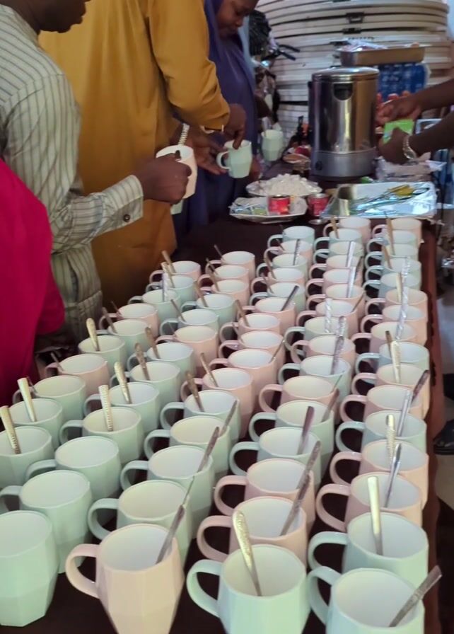 gathering of people around a table filled with an array of mugs, each containing a spoon. The mugs alternate in color between a pastel green and a pastel pink. People dressed in a variety of outfits are taking mugs from the table. A large stainless steel beverage dispenser is visible on the table, along with various food items. A man in a yellow shirt and grey pants stands on one side of the table, seemingly assisting with serving. The background shows other people, some buffet warming trays, and stacked chairs. The room appears to be an event hall or meeting space.