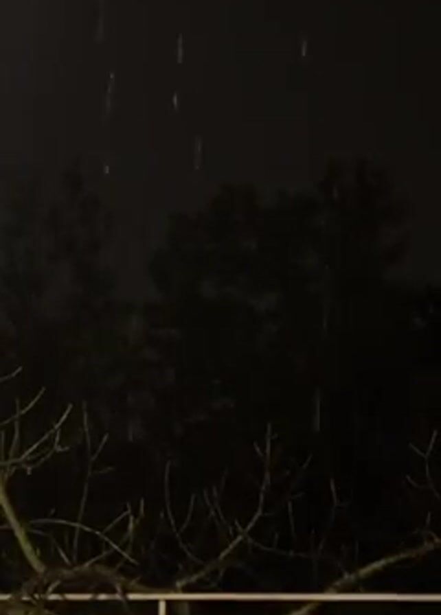 night scene with rain falling. The background is mostly dark, with the faint outline of trees visible. In the foreground, there is a white balcony railing, and branches from a tree are silhouetted against the darkness. The rain appears as streaks of light against the dark sky. The scene is quiet and still.