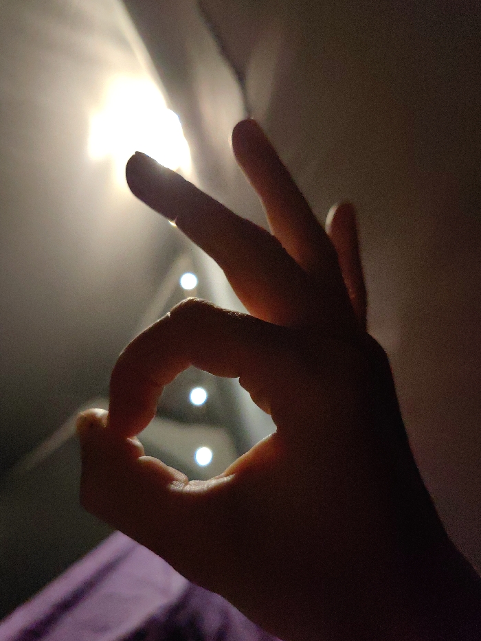 A hand forms an "OK" sign, with the thumb and forefinger creating a circle. Three fingers extend upwards. A bright light source is visible behind the hand, partially obscured by the fingers. Several smaller, indistinct light sources appear within the circle formed by the hand. The overall lighting is low, causing the hand to appear as a silhouette. A textured surface is faintly visible in the lower left corner of the frame. The background is predominantly dark.