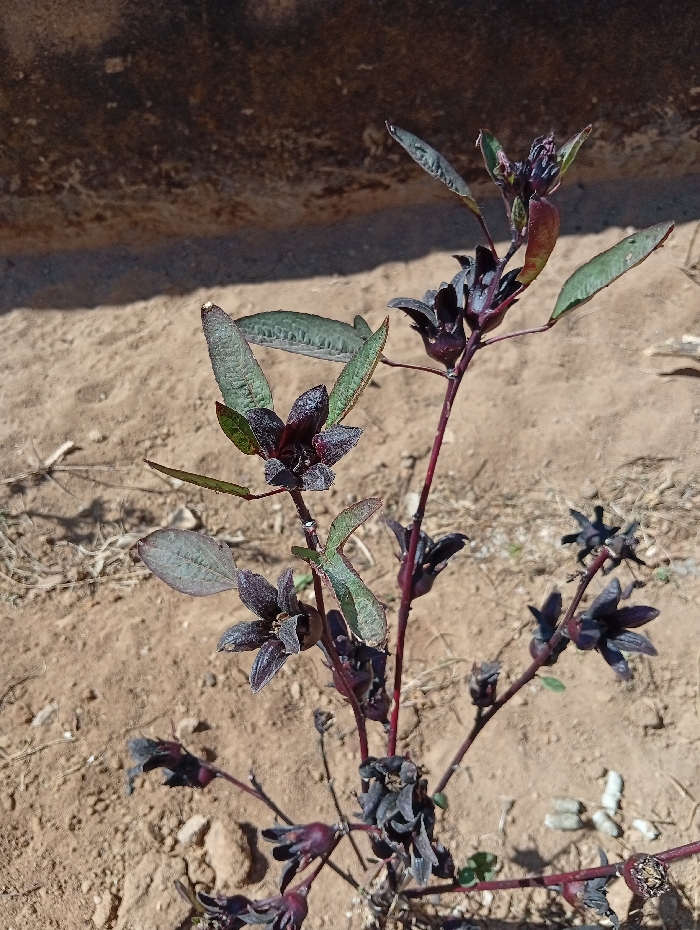 A single plant with dark purpurish-red stems and dark green to purplish, lanceolate leaves is depicted in a close-up outdoor shot. Numerous small, approximately 1-2 cm in diameter, dark purplish-black, star-shaped flowers or developing seed pods are present along the branching stems. The plant is rooted in light brown, sandy soil. In the upper background, a dark, textured surface, potentially a wall or large rock, is visible, casting a shadow onto the soil. Small fragments of light-colored organic or inorganic debris are scattered on the soil surface. No human subjects, animals, actions, or interactions are visible. Location: Unknown, Unknown.