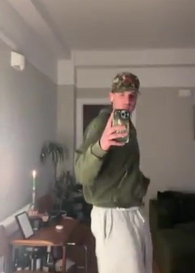 A person standing in front of a mirror in a room is taking a selfie with a smartphone. The person is wearing a camouflage cap, an olive green hoodie, and light gray sweatpants. They have earbuds in their ears. The room includes a table with items on it, a houseplant, a green sofa, and a picture frame on the wall. The lighting is soft and the overall atmosphere appears calm.