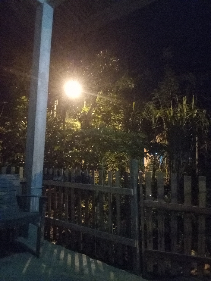 The image depicts a nighttime scene in the city of Unknown, Indonesia. In the foreground, a prominent light-colored square pillar, likely concrete, stands vertically on the left side, partially obscuring a dark wooden bench to its immediate left. The ground is dark, displaying elongated shadows cast by the fence and pillar. A weathered wooden picket fence runs horizontally across the midground, separating the foreground from dense vegetation. Beyond the fence, a bright, bare artificial light source emits a strong glare in the upper-middle left, illuminating the surrounding dark green foliage and trees. Various types of trees and tall plants are visible in the background, some partially silhouetted against the ambient light. In the deeper background, faint, diffuse artificial lights can be discerned through the dense tree line. No individuals are visible.